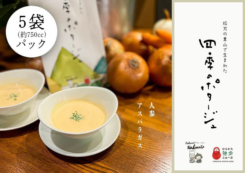 大阪枚方(ひらかた)の有機農家「ひらかた独歩ふぁーむ」さんのお野菜を、枚方の老舗「レストラン西本」のシェフが、ポタージュに仕上げました。